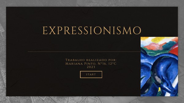 https://www.infopedia.pt/apoio/artigos/$expressionismo consultado a 29/9/2023 https://pt.m.wikipedia.org/wiki/Escultura_expressionista consultado a 29/9/2023 https://www.hisour.com/pt/expressionist-theater-34791/ consultado a 29/9/2023 https://www.spescoladeteatro.org.br/noticia/o-que-e-teatro-expressionista consultado a 30/9/2023 https://www.soliteratura.com.br/premodernismo/premodernismo17.php consultado a 30/9/2023 https://mundoeducacao.uol.com.br/literatura/expressionismo.htm consultado a 30/9/2023 https://pt.m.wikipedia.org/wiki/Pastelaria_Mexicana 17/9/2023 https://mundoeducacao.uol.com.br/literatura/expressionismo.htm consultado a 30/9/2023 https://meuartigo.brasilescola.uol.com.br/literatura/vanguardas-europeias-expressionismo.htm consultado a 28/10/2023 https://pt.wikipedia.org/wiki/Der_Blaue_Reiter consultado a 28 de outubro de 2023 https://www.wikiart.org/pt/artists-by-art-movement/expressionismo#!#resultType:masonry consultado a 30/10/2023 https://pt.wahooart.com/@@/8LHTS2-Ernst-Ludwig-Kirchner-cena-de-rua-em-berlim consultado a 30/10/2023 https://lauranehr.com/blog/kathe-kollwitz-esculturas/ consultado a 1/11/2023 - RIBEIRO, Avelino; Exame História A 12. 4ªedição. Leya educação, 2018 - FORTES, Alexandra; GOMES, Fátima Freitas; FORTES, José; Preparar os Testes História A 12. Areal editores, 2016.