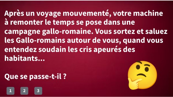 Après un voyage mouvementé, votre machine à remonter le temps se pose dans une campagne gallo-romaine. Vous sortez et saluez les Gallo-romains autour de vous, quand vous entendez soudain les cris apeurés des habitants... Que se passe-t-il ?