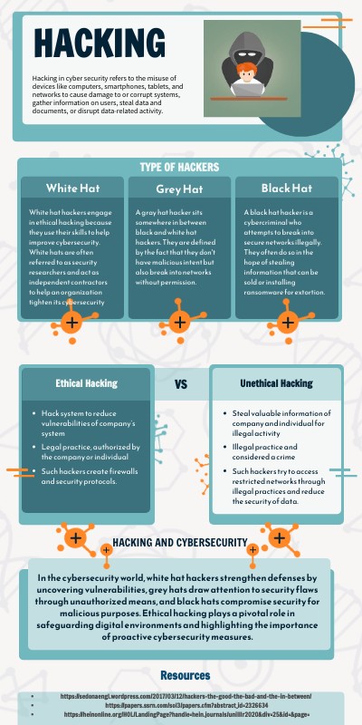 Hacking in cyber security refers to the misuse of devices like computers, smartphones, tablets, and networks to cause damage to or corrupt systems, gather information on users, steal data and documents, or disrupt data-related activity.