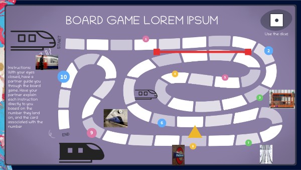 Instructions: With your eyes closed, have a partner guide you through the board game. Have your partner explain each instruction directly to you based on the number they land on, and the card associated with the number