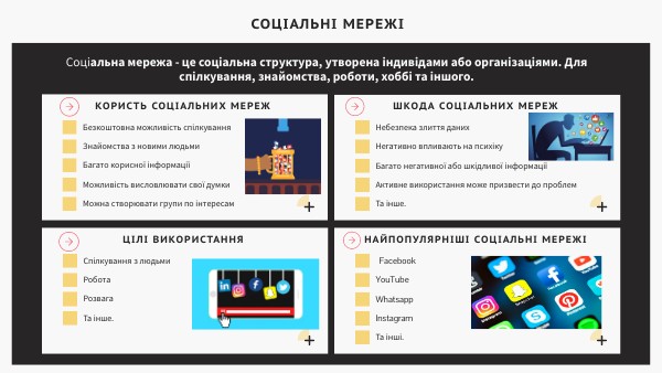 Соціальна мережа - це соціальна структура, утворена індивідами або організаціями. Для спілкування, знайомства, роботи, хоббі та іншого.