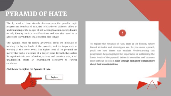 The Pyramid of Hate visually demonstrates the possible rapid progression from biased attitudes to bias-driven violence, offers an understanding of the danger of not tackling biases in society. It aims to help identify various manifestations and acts that need to be addressed to avoid the escalation from bias to hate. The pyramid helps us raising awareness about the difficulty of tackling the higher levels of the pyramid, and the importance of working at the lower levels. The higher level of the pyramid are merely the visible outcomes of a deeper issue. Beneath the surface lie ingrained attitudes, behaviors, actions, and inactions that, if left unaddressed, create an environment conducive to further escalation. Click below to explore the Pyramid of Hate: