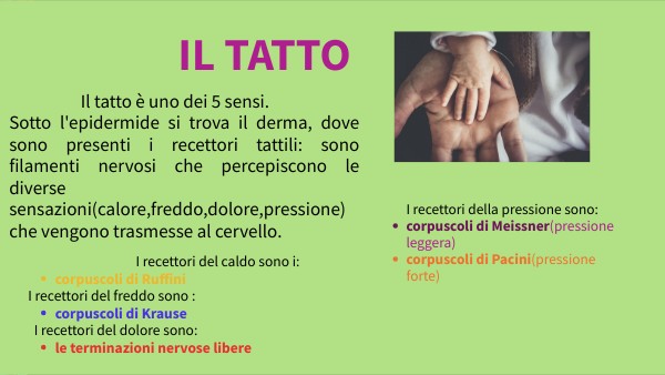 Il tatto è uno dei 5 sensi. Sotto l'epidermide si trova il derma, dove sono presenti i recettori tattili: sono filamenti nervosi che percepiscono le diverse sensazioni(calore,freddo,dolore,pressione) che vengono trasmesse al cervello.