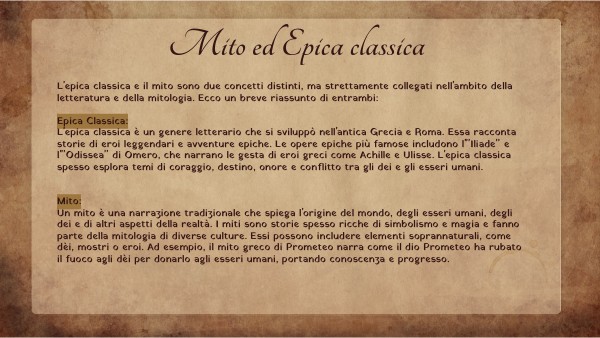 L'epica classica e il mito sono due concetti distinti, ma strettamente collegati nell'ambito della letteratura e della mitologia. Ecco un breve riassunto di entrambi: Epica Classica: L'epica classica è un genere letterario che si sviluppò nell'antica Grecia e Roma. Essa racconta storie di eroi leggendari e avventure epiche. Le opere epiche più famose includono l'"Iliade" e l'"Odissea" di Omero, che narrano le gesta di eroi greci come Achille e Ulisse. L'epica classica spesso esplora temi di coraggio, destino, onore e conflitto tra gli dei e gli esseri umani. Mito: Un mito è una narrazione tradizionale che spiega l'origine del mondo, degli esseri umani, degli dei e di altri aspetti della realtà. I miti sono storie spesso ricche di simbolismo e magia e fanno parte della mitologia di diverse culture. Essi possono includere elementi soprannaturali, come dèi, mostri o eroi. Ad esempio, il mito greco di Prometeo narra come il dio Prometeo ha rubato il fuoco agli dèi per donarlo agli esseri umani, portando conoscenza e progresso.