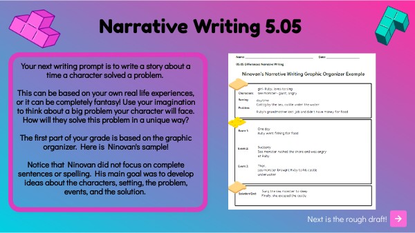 The next step is to turn your graphic organizer into a 3-paragraph draft! Paragraph 1: The Beginning (3-4 sentences) 1. Start with a sentence that introduces the setting. (Ex: Long ago in a far away kingdom... or One dark and stormy night...) 2. Introduce and describe your character. Notice that Ninovan mentioned that Ruby loved to sing. This important detail will be part of the solution! 3. Introduce the problem in your story. You don't have to explain every detail leading up to the problem. Notice that Ninovan mentioned Ruby didn't have money for food. This was the first problem that sent Ruby out on her journey, which lead to an even bigger problem! Problems like being too curious, not following directions, or a character feeling nervous or lonely can be introduced in the first paragraph and then expanded upon in the middle of the story. Paragraph 2: The Middle (4-5 sentences) 1. Describe the main events in your story. Be sure to really describe how the problem develops. 2. Include details on how the characters are feeling. Does the setting change? 3. Don't forget transition words! Paragraph 3: The End (3-4 sentences) 1. Describe the main events that lead to the ending. 2. Be sure to describe how the problem was solved. 3. You can add an extra detail at the end that wraps up the action. For Ninovan's draft I would recommend that he writes one more sentence about how Ruby made it back home to her grandmother.