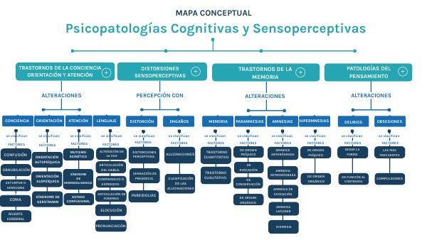 En este mapa mental se dan a conocer las psicopatologías cognitivas y sensoperceptivas que afectan mayormente a adultos mayores, así como los factores externos e internos de cada alteración.