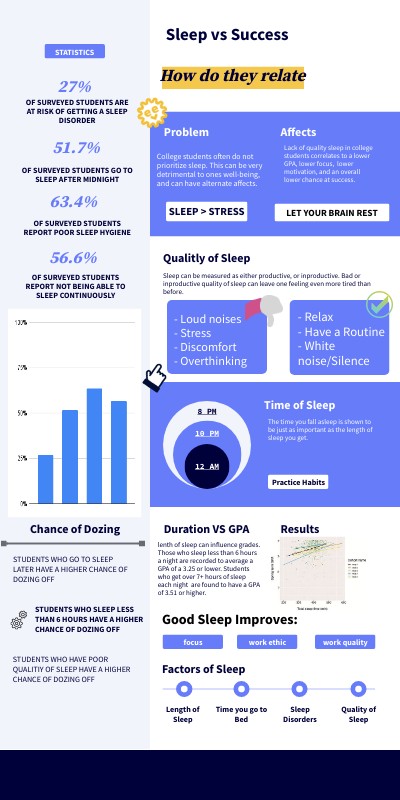 Lack of quality sleep in college students correlates to a lower GPA, lower focus, lower motivation, and an overall lower chance at success.