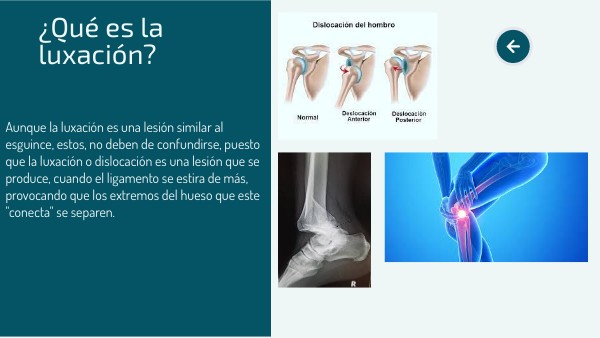 Aunque la luxación es una lesión similar al esguince, estos, no deben de confundirse, puesto que la luxación o dislocación es una lesión que se produce, cuando el ligamento se estira de más, provocando que los extremos del hueso que este "conecta" se separen.
