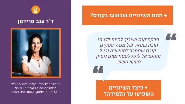 הסטודנטים מרגישים שהם מתנסים בפועל בתהליכי יעוץ עסקיים. עם חיבור לשטח ויישום התאוריה באופן חוויתי.כתי..