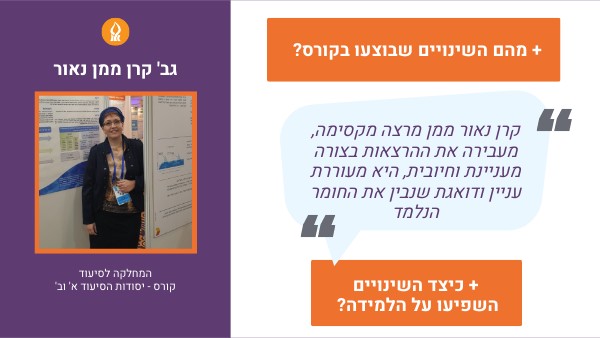 קרן נאור ממן מרצה מקסימה, מעבירה את ההרצאות בצורה מעניינת וחיובית, היא מעוררת עניין ודואגת שנבין את החומר הנלמד