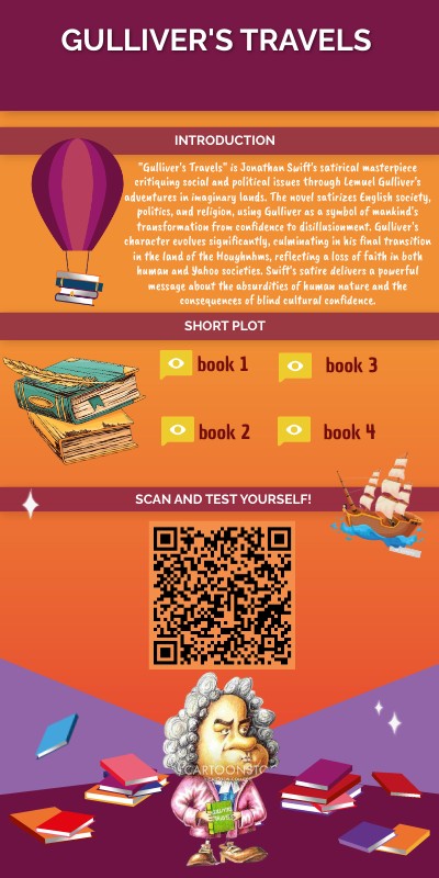 "Gulliver's Travels" is Jonathan Swift's satirical masterpiece critiquing social and political issues through Lemuel Gulliver's adventures in imaginary lands. The novel satirizes English society, politics, and religion, using Gulliver as a symbol of mankind's transformation from confidence to disillusionment. Gulliver's character evolves significantly, culminating in his final transition in the land of the Houyhnhms, reflecting a loss of faith in both human and Yahoo societies. Swift's satire delivers a powerful message about the absurdities of human nature and the consequences of blind cultural confidence.