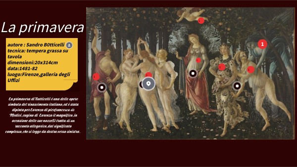 La primavera di Botticelli é una delle opere simbolo del rinascimento italiano,ed é stata dipinta per Lorenzo di pierfrancesco de Medici,cugino di Lorenzo il magnifico,in occasione delle sue nozzeSi tratta di un racconto allegorico,dal significato complesso,che si legge da destra verso sinistra.