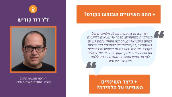 דוד הוא מרצה נהדר, משלב אלמנטים של משחקיות בשיעורים, מדבר על נושאים רלוונטים לחיים ואקטואליים, המרצה היחיד שזמין לנו גם בוואטסאפ, נתן לתלמידים להתבטא ואפשרויות לקבלת בונוסים. דאג לנו גם לאפשרות להשלים את השיעורים באופן מקוון. בנה בוט של שאלות למבחן- ממש מושלם. מאחלת לעצמי ללמוד איתו עוד קורסים.