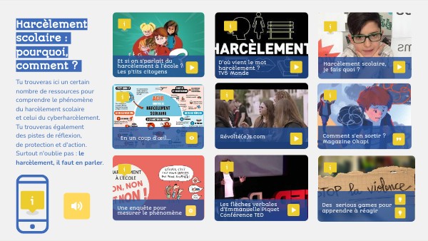 Tu trouveras ici un certain nombre de ressources pour comprendre le phénomène du harcèlement scolaire et celui du cyberharcèlement. Tu trouveras également des pistes de réflexion, de protection et d'action. Surtout n'oublie pas : le harcèlement, il faut en parler.