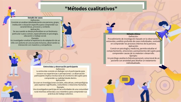 Estudio de casos Definición: Consiste en analizar detalladamente una persona, grupo, institución o situación específica para comprender sus características, procesos y contexto. Aplicación: Se usa cuando se desea profundizar en un fenómeno particular o poco común, especialmente en psicología, educación o trabajo social. Ejemplo: Un investigador analiza la experiencia de adaptación de un niño con autismo en una escuela inclusiva, observando su interacción con maestros y compañeros.