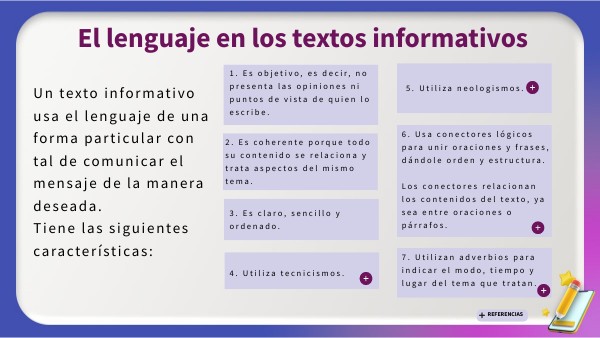 Un texto informativo usa el lenguaje de una forma particular con tal de comunicar el mensaje de la manera deseada.Tiene las siguientes características: