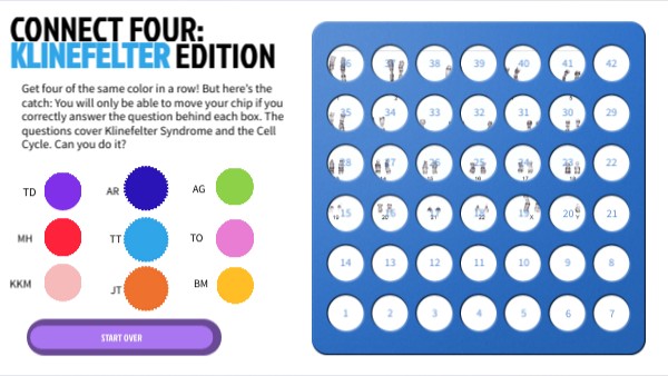 Get four of the same color in a row! But here’s the catch: You will only be able to move your chip if you correctly answer the question behind each box. The questions cover Klinefelter Syndrome and the Cell Cycle. Can you do it?