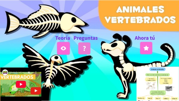 Todos los animales vertebrados se caracterizan por tener huesos y una columna vertebral, formada por vértebras. Estos animales tienen el cuerpo dividido en cabeza, tronco y extremidades y la mayoría tienen cola, pero, por lo demás, los grupos son muy distintos unos de otros. Los animales vertebrados se clasifican en 5 grupos:
