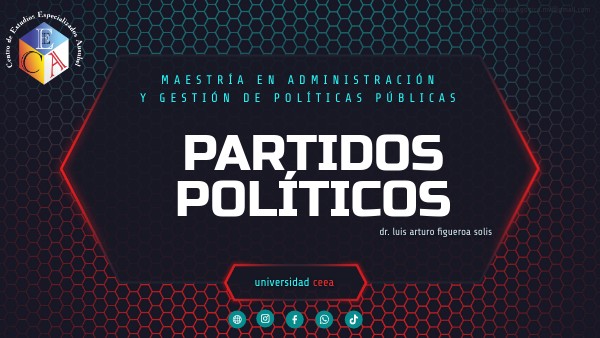 El curso “Partidos Políticos” integra contenidos teóricos, históricos, empíricos y normativos electorales para contribuir en la formación de los maestrantes en Administración en Gobierno y Políticas Públicas. Proporciona herramientas teórico-prácticas para entender y proponer nuevos modelos para el papel de los partidos políticos en México. El curso tiene relevancia dado que contribuye al fortalecimiento del conocimiento de estas entidades políticas y coadyuva a entender mejor el ámbito de acción de otras asignaturas del programa, tales como “Sistema Electoral Mexicanos” (por ser parte de este) y “Pensamiento Político de México” (por ser parte de una filosofía entre los grupos políticos). En este sentido, el egresado podrá, fácilmente, entender e/o incorporarse en los campos del sector público, político o ciudadano.