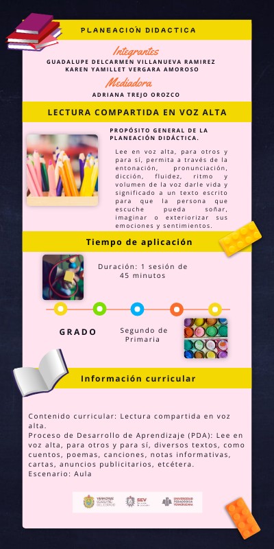 Contenido curricular: Lectura compartida en voz alta.Proceso de Desarrollo de Aprendizaje (PDA): Lee en voz alta, para otros y para sí, diversos textos, como cuentos, poemas, canciones, notas informativas, cartas, anuncios publicitarios, etcétera. Escenario: Aula