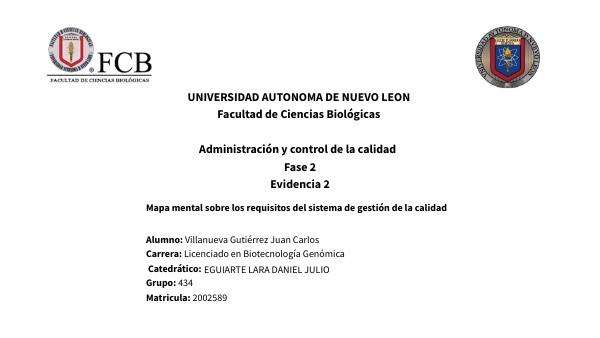 UNIVERSIDAD AUTONOMA DE NUEVO LEON Facultad de Ciencias Biológicas Administración y control de la calidad Fase 2 Evidencia 2