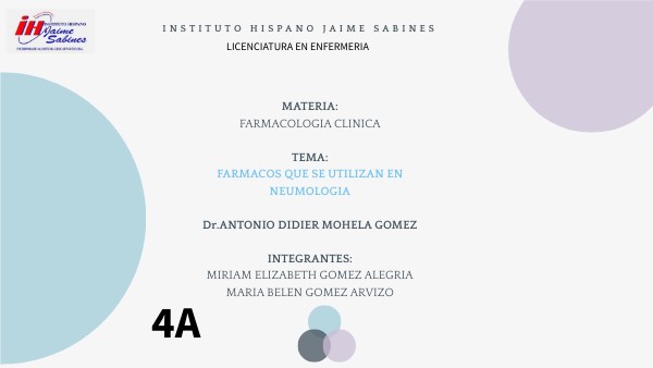 MATERIA: FARMACOLOGIA CLINICA TEMA:FARMACOS QUE SE UTILIZAN EN NEUMOLOGIA Dr.ANTONIO DIDIER MOHELA GOMEZ INTEGRANTES: MIRIAM ELIZABETH GOMEZ ALEGRIA MARIA BELEN GOMEZ ARVIZO