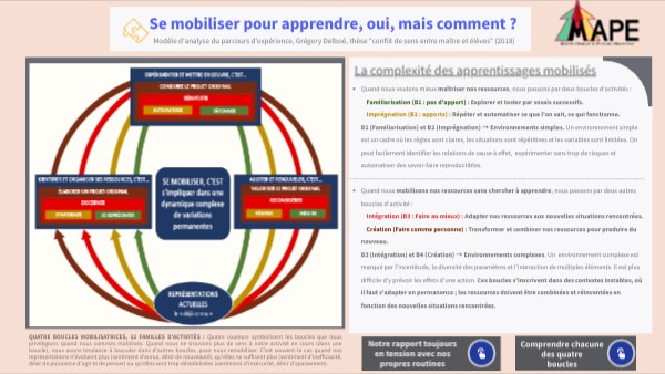 - Quand nous mobilisons nos ressources sans chercher à apprendre, nous passons par deux autres boucles d'activité : Intégration (B3 : Faire au mieux) : Adapter nos ressources aux nouvelles situations rencontrées. Création (Faire comme personne) : Transformer et combiner nos ressources pour produire du nouveau.B3 (Intégration) et B4 (Création) → Environnements complexes. Un environnement complexe est marqué par l’incertitude, la diversité des paramètres et l’interaction de multiples éléments. Il est plus difficile d’y prévoir les effets d’une action. Ces boucles s’inscrivent dans des contextes instables, où il faut s’adapter en permanence ; les ressources doivent être combinées et réinventées en fonction des nouvelles situations rencontrées.
