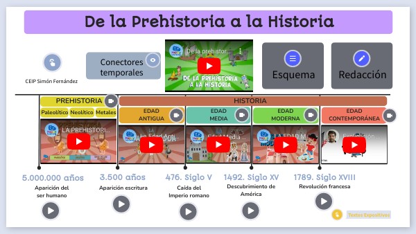 Vamos a viajar de la Prehistoria a la Historia. La primera etapa es la Prehistoria, hace 5 millones de años. La Prehistoria se dividide en primer lugar en el Paleolítico, donde se descubre el fuego, en segundo lugar, en el Neolítico, practicando la agricultura y ganadería, y, por último, en la Edad de los Metales, con herramientas de cobre, bronce y hierro. La Historia comienza con la escritura hace 3.500 años a. C. La primera etapa de la Historia es la Edad Antigua y en ella hubo tres civilizaciones importantísimas: la egipcia, con sus pirámides, la griega, con las olimpiadas, y la romana, con su poderoso imperio.