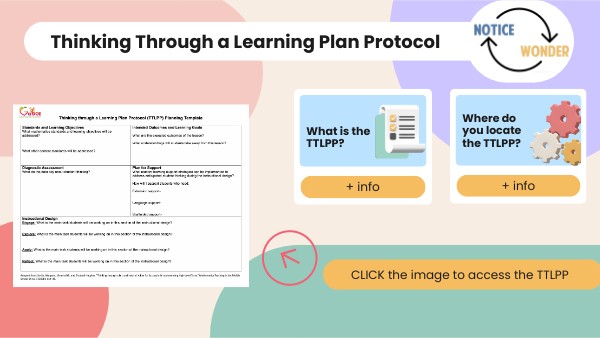 The Thinking Through a Learning Plan Protocol will help teachers get in the mindset for how they should think through a learning plan. This template will help guide teachers through understanding the components of the learning plan and help plan for implementation of the learning plans. Today we are going to think through a learning plan as a Professional Learning Committee (PLC)!