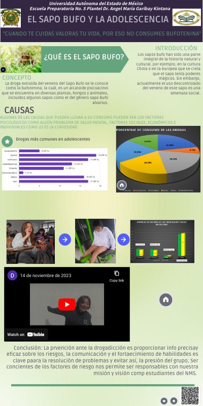 EQUIPO: 4 De Zamudio, S. A. (1979). Efecto de bloqueadores alfa y beta en la respuesta hidrosmótica de la piel aislada del sapo bufo arenarum a la adrenalina, vasopresina y angiostensina II. https://www.lillo.org.ar/journals/index.php/acta-zoologica-lilloana/article/view/966 Luisa, Q. S. M. (2019, 1 septiembre). Prevención de adicciones. Empoderar a los adolescentes para el establecimiento de estilos de vida saludables: el caso de los inhalantes. http://hdl.handle.net/20.500.11799/104939 Solís, M. S. (2011). Estudio del consumo de drogas en estudiantes universitarios. Redalyc.org. https://www.redalyc.org/articulo.oa?id=582663867002 Horák, M. (2019). Bufo alvarius: evidencias literarias y controversias en torno a su uso tradicional. Dialnet. https://dialnet.unirioja.es/servlet/articulo?codigo=6761086 National Geographic España. (2023, 2 noviembre). National Geographic. https://www.nationalgeographicla.com/animales/2023/05/el-veneno-del-sapo-bufo-como-actua-el-potente-alucinogeno-que-produce-ese-anfibio#:~:text=%C2%BFCu%C3%A1l%20e