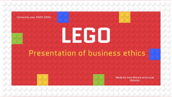 - Created in 1960 by OLE KIRK Christiansen in Denmark - World leader in toys - Creativity, Learning, Quality and Inclusiveness - Social and environmental responsibility are priorities. - Partnerships with Star Wars or Harry Potter