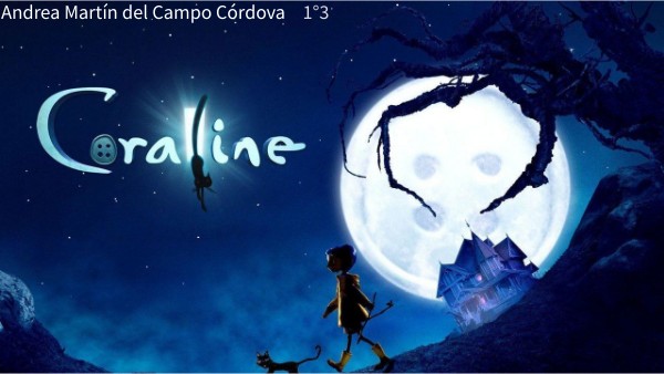 Coraline es una pelicula basada en un libro sobre una niña inquieta, inteligente y muy valiente que se muda a vivir a una nueva casa con su familia durante el verano. Cuando ella se pone a explorar la casa se da cuenta de que en esa casa hay una puerta secreta la cual activa su curiosid y decide abrirla, pero al abrirla se da cuenta de que esta sellada con ladrillos y decide cerrarla, en su primera noche en la casa escucha sonidos de ratones y al verlos uir ella decide seguirlos, al seguirlos se da cuenta que los ratones entraron por la puerta y al abrirla se da cuenta que hay un tunel y ella entra por curiosidad y en el otro lado descubre que hay una casa igual a la otra nada más que algo más alegre y se pone a investigar, al pensar a ver visto a su madre le pregunta el que hace ahi y ella al voltearse sorprende a Coraline ya que ella en ves de ojos tiene botones, pero ella le explica a coraline que es su otra madre y convence a Coraline y le dice que valla por su otro padre el cual ya no esta haciendo sus actividades comunes sino que ahora esta tocando un piano y le canta una canción de vienvenida a Coraline, fueron a cenar algo que dejo a Coraline feliz, al siguiente día ella le cuenta todo a sus padres pero ellos no le prestan mucha atención y le sugieren ir a platicarselo a los vecinos, en la siguinete noche Coraline decide volver para comprovar que no fuera un sueño, y al ir cena y la invitan al circo de su vecino de arriba con un chico que conocio al llagar a su casa en el mundo real, a ella le agrada mucho ese lugar que aunque su madre le haya cerrado la puerta ella va ya que alla si le prestan más atneción que en la vida real, al ir ella fua a la función de sus vecinas de abajo y después de alli ve a sus otros padres, y al entrar a la casa ellos le ofrecen quedarse y ella acepta pero la condición es coserse los ojos y ella ve que no es un lugar en el que ella quiere estra y decide intentar escapar.