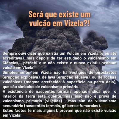 Sempre ouvi dizer que existia um Vulcão em Vizela (e eu até acreditava), mas depois de ter estudado o vulcanismo em Ciências, percebi que não existe e nunca existiu nenhum vulcão em Vizela! Simplesmente, em Vizela não há vestígios de piroclastos (erupção explosiva), de lava (erupção efusiva), ou de rochas vulcânicas (magma arrefecido à superfície ou perto dela), que são símbolos de vulcanismo primário. A existência de nascentes termais apenas indica que o interior da terra está quente, mas isso não é prova de vulcanismo primário (vulcões) , mas sim de vulcanismo secundário (nascentes termais, géisers e fumarolas). Estes factos (e mais alguns), provam que não existe vulcão em Vizela!