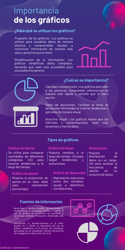 Moret-Tatay, C., Benlloch-Dualde, J. V., Martí-Belda, A., Cholbi-Atienza, R., & González-Candelas, F. (2018). El uso de gráficos en el proceso de enseñanza y aprendizaje. Didáctica, Innovación y Multimedia, (38), 1-15. arcía-Murillo, A., Morales-Gutiérrez, A., & Cobo-Rendón, M. J. (2019). La importancia del uso de gráficos estadísticos en el proceso de enseñanza-aprendizaje de los estudiantes. Revista Internacional de Investigación en Educación, 8(1), 8-25.