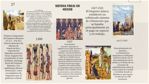 Los Aztecas El antecedente más antiguo del pago de tributos en México es el establecido en los códices aztecas, el cual obligaba a sus súbditos a otorgar ofrendas al rey cambio de beneficios para su comunidad. Durante esta etapa se crean los "tequiámatl" que hacían la función de mantener un registro de los tributos. Debido a la importancia que toma la tributación para el imperio azteca nombraron a los "Calpixquis", quienes fueron los primeros encargados de recaudar los tributos.