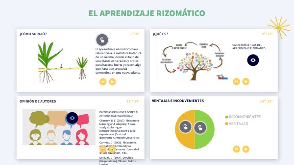 El aprendizaje rizomático hace referencia a la metáfora botánica de un rizoma, donde el tallo de una planta echa raíces y brotes para hacerse fuerte y crecer, algo que hará que se pueda convertirse en una nueva planta.