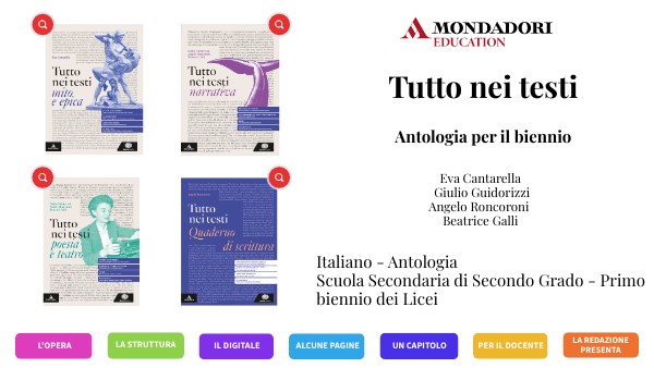 IL PROGETTO DIDATTICO: LEGGERE PER SCRIVERE Essere buoni lettori aiuta a scrivere: da questa semplice evidenza nasce un progetto che vuole far crescere di pari passo le competenze di analisi del testo e di scrittura, facendo leva sulla partecipazione attiva e l’ingaggio. TUTTO IN UN TESTO Lo spirito di questa rubrica è proporre testi utili a cogliere in modo diretto e immediato i segreti di un bel testo letterario. Il percorso didattico si avvale di un’analisi visiva, una lettura audio ed esercizi mirati. A questo scopo, nel volume di narrativa sono proposti racconti completi. LABORATORIO DI SCRITTURA CREATIVA Liberamente ispirato alla didattica del Writing and Reading Workshop, propone otto racconti con attività di produzione legate a otto tecniche di scrittura creativa: è anche un bel ripasso per diventare lettori più esperti. IL QUADERNO DI SCRITTURA DI ANGELO RONCORONI Compagno prezioso per affrontare tutte le tipologie di scrittura scolastica. Con 50 testi (tra testi-guida e testi di verifica) e simulazioni guidate di Prove INVALSI.