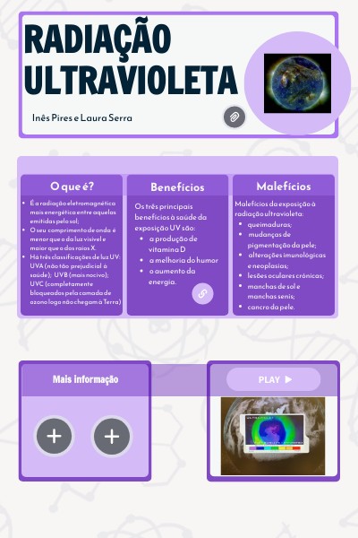 - Há três classificações de luz UV: UVA (não tão prejudicial à saúde); UVB (mais nocivo); UVC (completamente bloqueados pela camada de ozono logo não chegam à Terra)