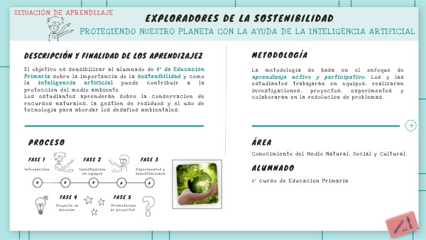El objetivo es sensibilizar al alumnado de 6º de Educación Primaria sobre la importancia de la sostenibilidad y cómo la inteligencia artificial puede contribuir a la protección del medio ambiente. Los estudiantes aprenderán sobre la conservación de recursos naturales, la gestión de residuos y el uso de tecnología para abordar los desafíos ambientales.