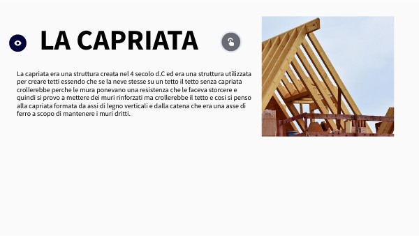 La capriata era una struttura creata nel 4 secolo d.C ed era una struttura utilizzata per creare tetti essendo che se la neve stesse su un tetto il tetto senza capriata crollerebbe perche le mura ponevano una resistenza che le faceva storcere e quindi si provo a mettere dei muri rinforzati ma crollerebbe il tetto e cosi si penso alla capriata formata da assi di legno verticali e dalla catena che era una asse di ferro a scopo di mantenere i muri dritti.