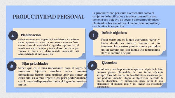 La productividad personal es entendida como el conjunto de habilidades y tecnicas que utiliza una persona con objetivo de llegar a diferentes objetivos planteados ,haciendolo en el menor tiempo posible y con la eficacia requerida.