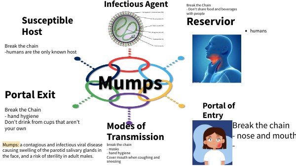 Mumps: a contagious and infectious viral disease causing swelling of the parotid salivary glands in the face, and a risk of sterility in adult males.