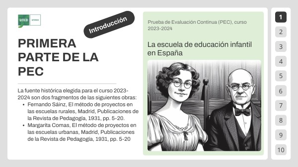 - Título de la primera parte de la PEC: El método de proyectos en las escuelas rurales y urbanas en España en los años 1930. Iniciar el desarrollo del trabajo a continuación del título, en la misma página.
