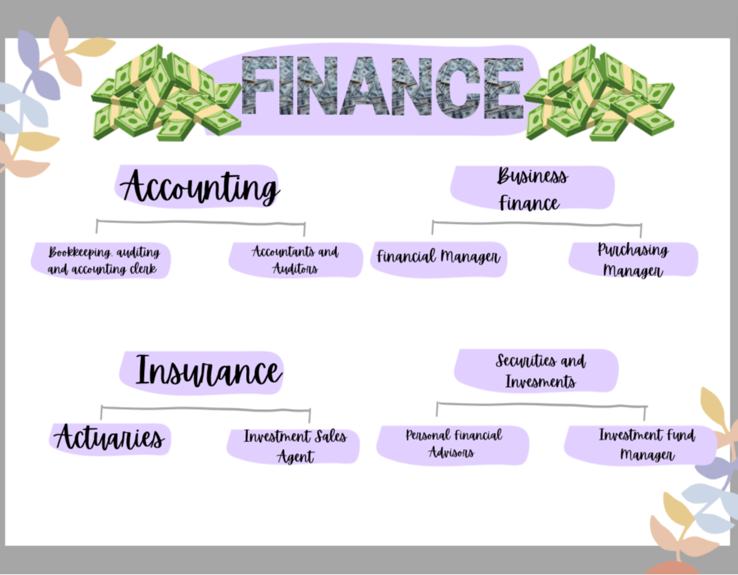 In finance you might provide financial services to a business or person. you might give financial advice toa business or maintain financial records.they keep track of money, work in financial planning, banking, or insurance.https://share.icloud.com/photos/0202Gl3MMvQE68StGgA8iRi5w