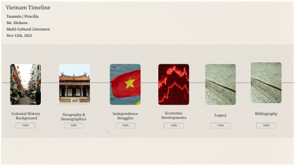 Colonial History:“The Conquest of Vietnam by France.” Encyclopædia Britannica, Encyclopædia Britannica, inc., www.britannica.com/place/Vietnam/The-conquest-of-Vietnam-by-France. Accessed 2 Nov. 2023. Geography & Demographics: “Vietnam.” Encyclopædia Britannica, Encyclopædia Britannica, inc., 2 Nov. 2023, www.britannica.com/place/Vietnam. Independence Struggles:U.S. Department of State, U.S. Department of State, history.state.gov/milestones/1953-1960/dien-bien-phu. Accessed 2 Nov. 2023. “Vietnam Declares Its Independence from France | September 2, 1945.” History.Com, A&E Television Networks, www.history.com/this-day-in-history/vietnam-independence-proclaimed. Accessed 2 Nov. 2023. Economic Development: “The Story behind Viet Nam’s Miracle Growth.” World Economic Forum, www.weforum.org/agenda/2018/09/how-vietnam-became-an-economic-miracle/. Accessed 2 Nov. 2023.
