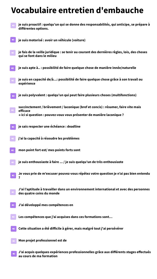 je suis proactif : quelqu’un qui se donne des responsabilités, qui anticipe, se prépare à différentes options. je suis motorisé : avoir un véhicule (voiture) je fais de la veille juridique : se tenir au courant des dernières règles, lois, des choses qui se font dans le milieu je suis apte à.. : possibilité de faire quelque chose de manière innée/naturelle je suis en capacité de/à...: possibilité de faire quelque chose grâce à son travail ou expérience je suis polyvalent : quelqu’un qui peut faire plusieurs choses (multifonctions) succinctement / brièvement / laconique (bref et concis) : résumer, faire vite mais efficace → ici si question : pouvez-vous vous présenter de manière laconique ? je sais respecter une échéance : deadline j’ai la capacité à résoudre les problèmes mon point fort est/ mes points forts sont je suis enthousiaste à faire ... / je suis quelqu’un de très enthousiaste Je vous prie de m’excuser pouvez-vous répétez votre question je n’ai pas bien entendu ? J’ai l’aptitude à travailler dans un environnement international et avec des personnes des quatre coins du monde J’ai développé mes compétences en Les compétences que j’ai acquises dans ces formations sont… Cette situation a été difficile à gérer, mais malgré tout j'ai persévérer Mon projet professionnel est de J’ai acquis quelques expériences professionnelles grâce aux différents stages effectués au cours de ma formation