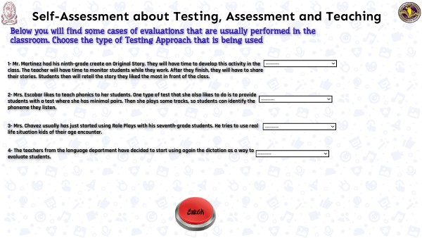 1- Mr. Martinez had his ninth-grade create an Original Story. They will have time to develop this activity in the class. The teacher will have time to monitor students while they work. After they finish, they will have to share their stories. Students then will retell the story they liked the most in front of the class. 2- Mrs. Escobar likes to teach phonics to her students. One type of test that she also likes to do is to provide students with a test where she has minimal pairs. Then she plays some tracks, so students can identify the phoneme they listen. 3- Mrs. Chavez usually has just started using Role Plays with his seventh-grade students. He tries to use real life situation kids of their age encounter. 4- The teachers from the language department have decided to start using again the dictation as a way to evaluate students.