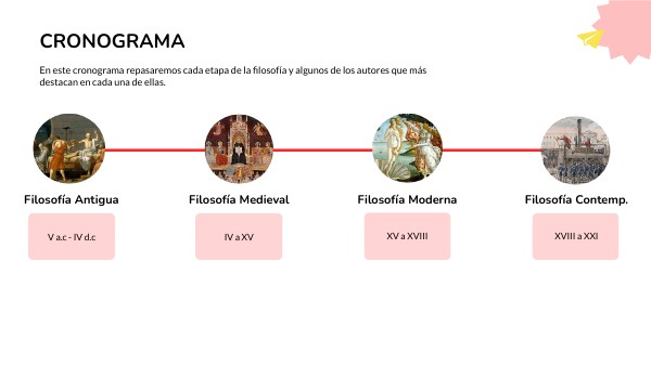 En este cronograma repasaremos cada etapa de la filosofía y algunos de los autores que más destacan en cada una de ellas.