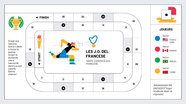Scegli una nazione, lancia il dado e muovi la pedina. Scopri la domanda che si nasconde dentro a ogni casella. Bonne chance !