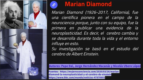 Marian Diamond (1926-2017, California), fue una científica pionera en el campo de la neurociencia porque, junto con su equipo, fue la primera en publicar una evidencia de la neuroplasticidad. Es decir, el cerebro cambia y se desarrolla durante toda la vida y el entorno influye en esto.Su investigación se basó en el estudio del cerebro de Albert Einstein.